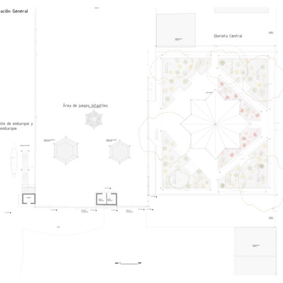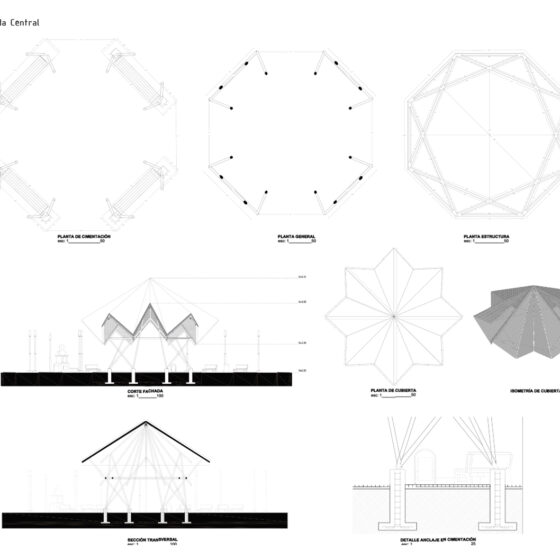 • El parque central, cuyo diseño se alineó con los objetivos del programa arquitectónico, promoviendo la revalorización de los sistemas constructivos y los materiales tradicionales y vernáculos de la región. Se propuso el uso de caña guadua y paja toquilla, materiales representativos del entorno. En cuanto a la morfología de la ramada central, se reinterpretó y escaló para aumentar el área de sombra mediante la cubierta de paja toquilla, que debe tener una inclinación mínima de 45 grados para evitar el estancamiento de agua y la descomposición del material. Esta es una de las propuestas tecnológicas del proyecto. Además, se incorporarán zonas de descanso, como bancos, para el uso de los visitantes con una zona de sombra y encuentro familiar que funciona como escenario para eventos culturales y asambleas comunitarias.