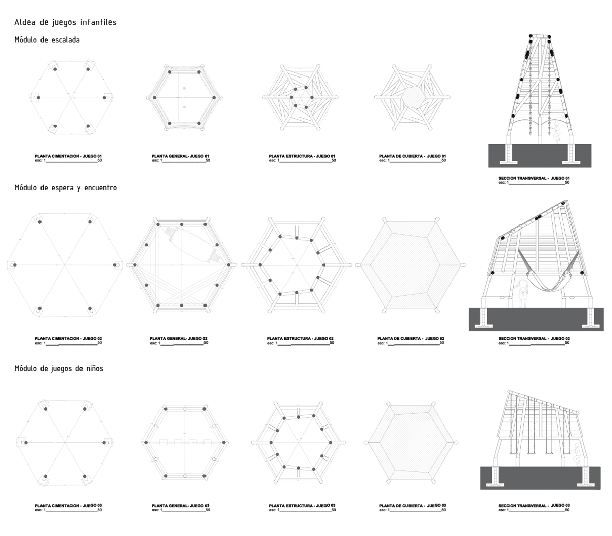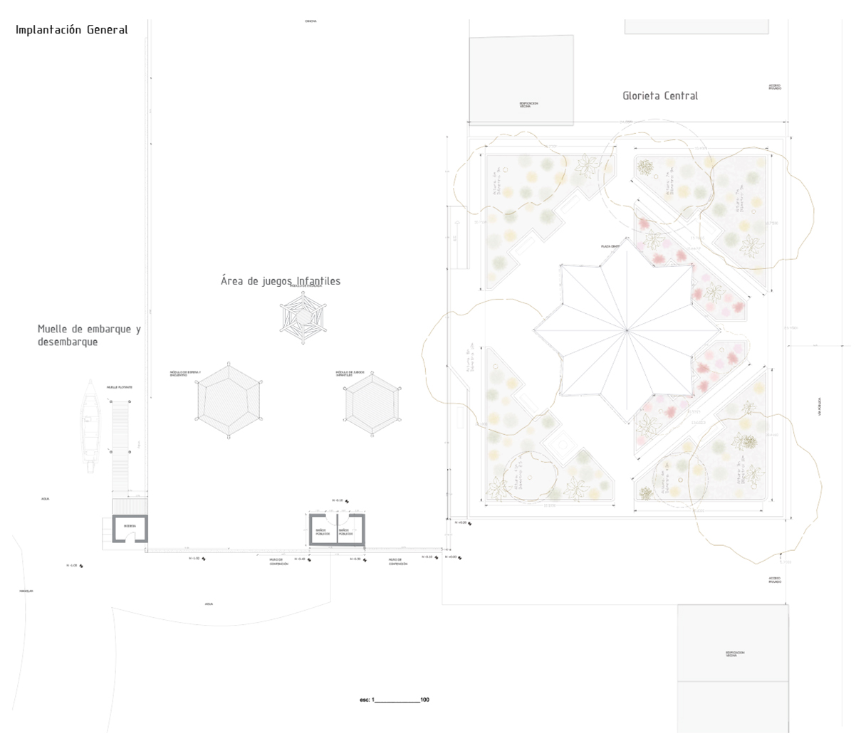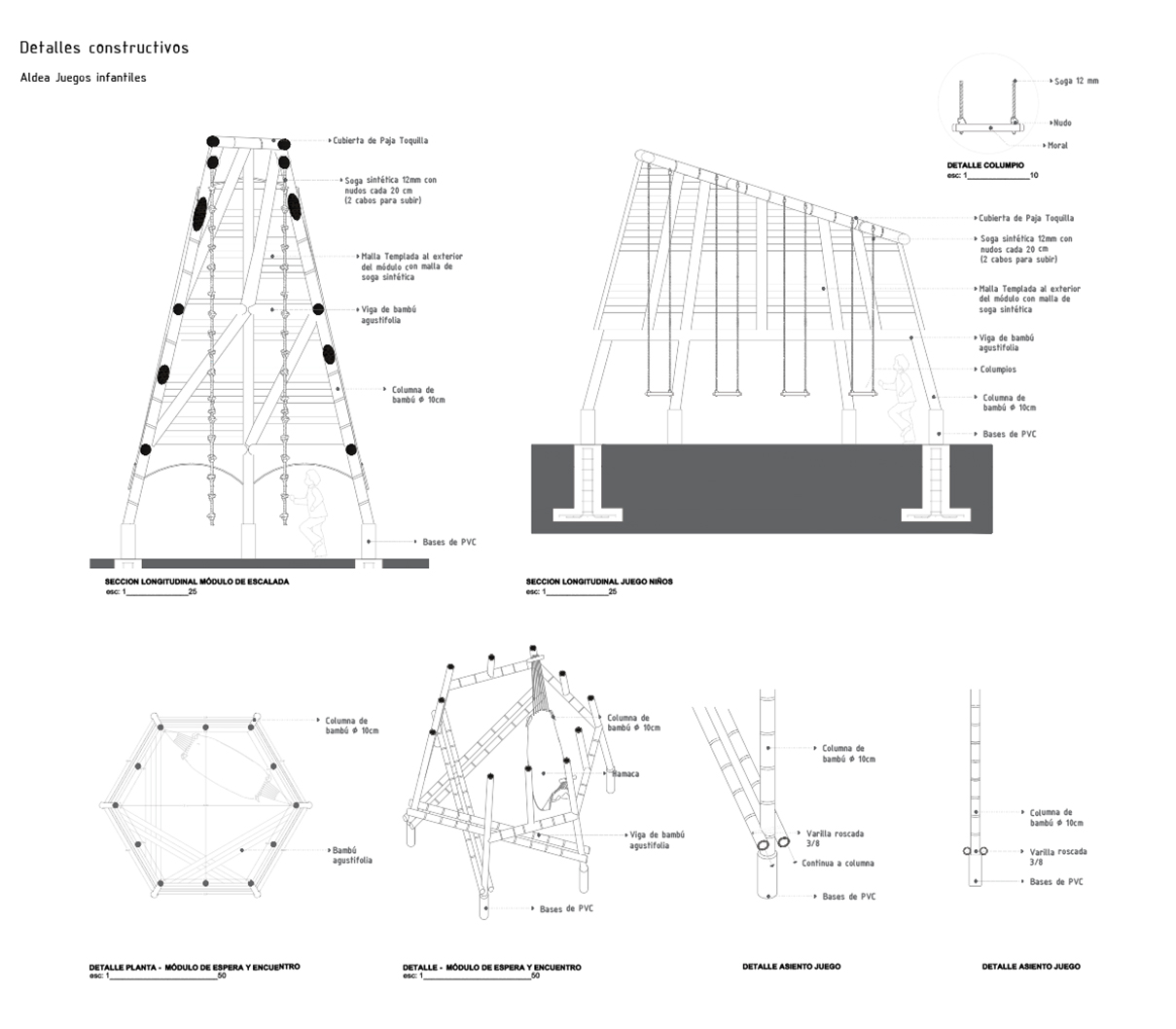 • Los juegos infantiles, concebidos como una “aldea del palenque”, un espacio multifuncional de exploración para la infancia que consiste en tres estructuras visibles, que sirvan como puntos de encuentro y generen recuerdos para los niños, revalorizando el uso del bambú y la paja toquilla. Se realizó un estudio sobre las actividades que los niños realizan, alejándose de los modelos urbanos preestablecido, se propusieron actividades como escalada en redes, un módulo de espera y encuentro y un módulo de juegos infantiles, en el que se incluyen columpios para los niños. Un aspecto fundamental es la creación de áreas sombreadas para los juegos, ya que el clima soleado dificulta su uso adecuado. El objetivo es convertir esta área en un espacio familiar, donde los adultos puedan observar a los niños mientras esperan las barcas.