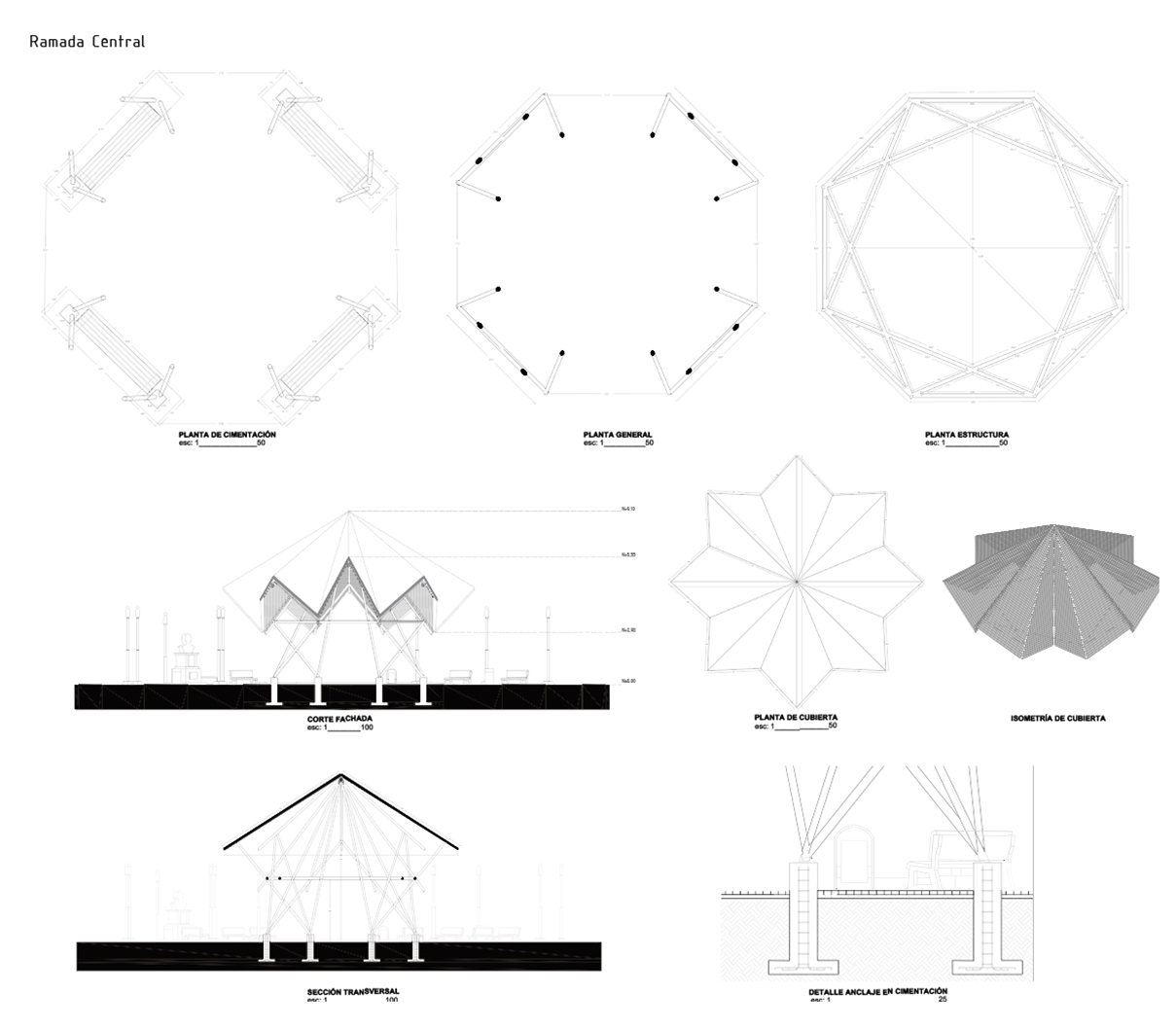 • El parque central, cuyo diseño se alineó con los objetivos del programa arquitectónico, promoviendo la revalorización de los sistemas constructivos y los materiales tradicionales y vernáculos de la región. Se propuso el uso de caña guadua y paja toquilla, materiales representativos del entorno. En cuanto a la morfología de la ramada central, se reinterpretó y escaló para aumentar el área de sombra mediante la cubierta de paja toquilla, que debe tener una inclinación mínima de 45 grados para evitar el estancamiento de agua y la descomposición del material. Esta es una de las propuestas tecnológicas del proyecto. Además, se incorporarán zonas de descanso, como bancos, para el uso de los visitantes con una zona de sombra y encuentro familiar que funciona como escenario para eventos culturales y asambleas comunitarias.
