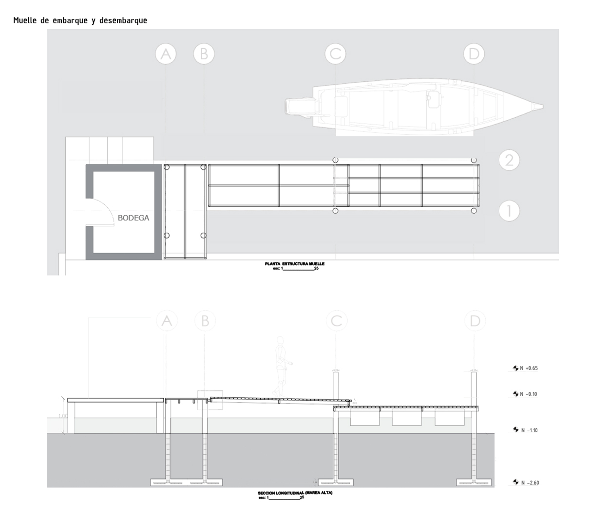 Además, se priorizó el uso de materiales de bajo mantenimiento que puedan ser fácilmente gestionados por la comunidad. Se propone un muelle flotante de madera, combinado con contenedores plásticos para asegurar su flotabilidad. El ancho del muelle garantiza la fluidez en el