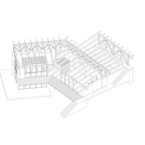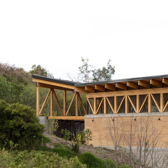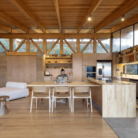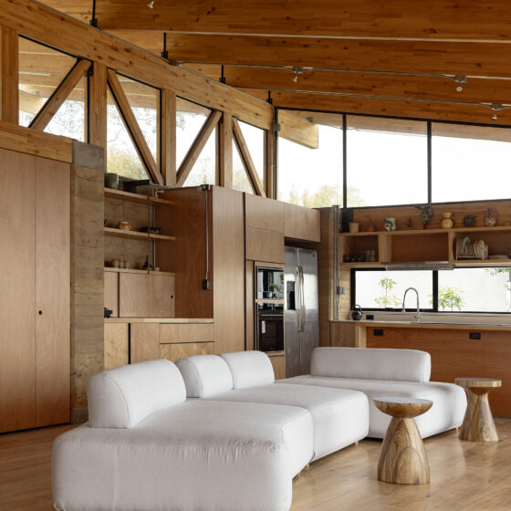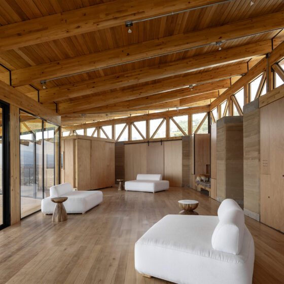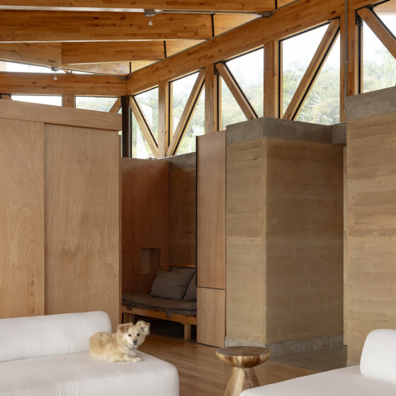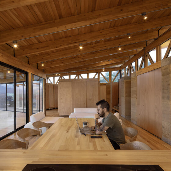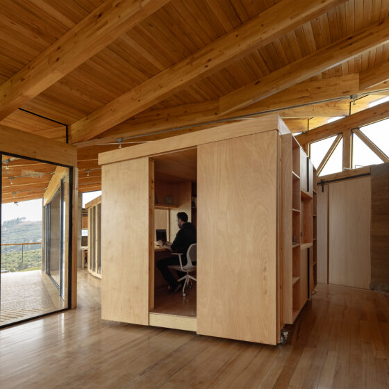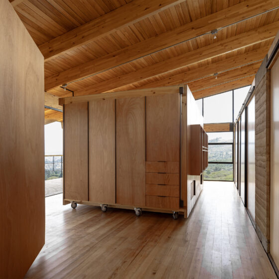 La casa se resuelve bajo una gran cubierta inclinada a una sola agua, apoyada en el muro de tapial y en una estructura de madera laminada que remata en una viga transversal de gran transparencia. Esta cubierta genera un gesto claro de cobijo, permitiendo que debajo de ella ocurra una multiplicidad de configuraciones. El espacio no está dividido por muros ni particiones fijas: todo se organiza a partir de un único muro servidor y una serie de elementos móviles que permiten transformar el uso del espacio día a día.