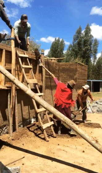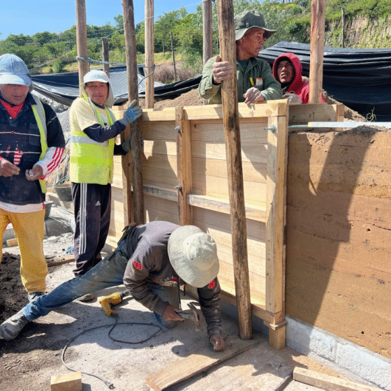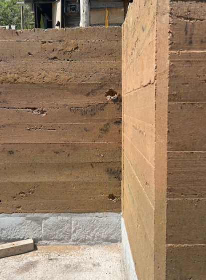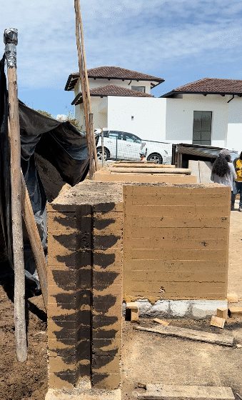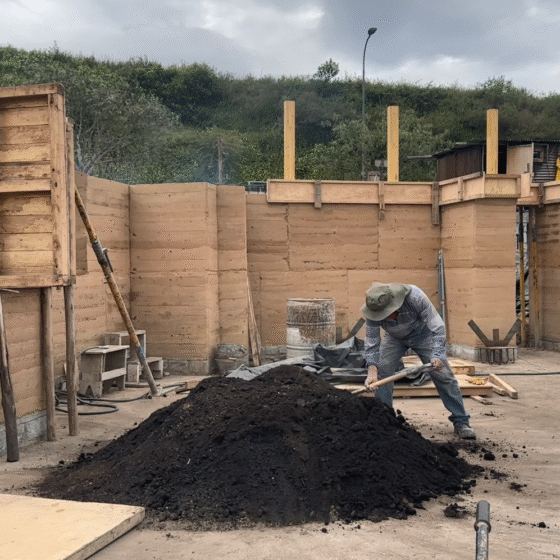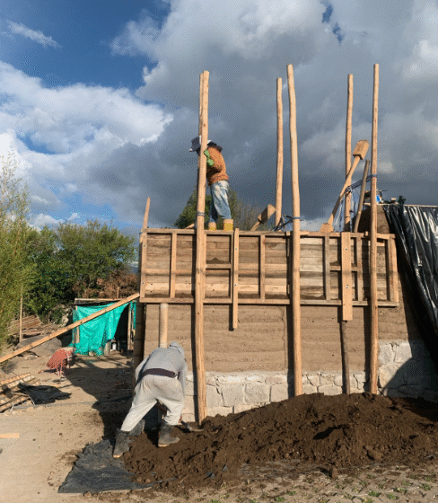La cimentación y los primeros muros son de piedra del sitio, aportando masa térmica y continuidad material con el entorno. Sobre estos se levanta un muro de tapial calicostrado —una técnica ancestral de construcción con tierra compactada estabilizada— que, además de dar carácter tectónico al proyecto, funciona como elemento estructural, climático y programático.