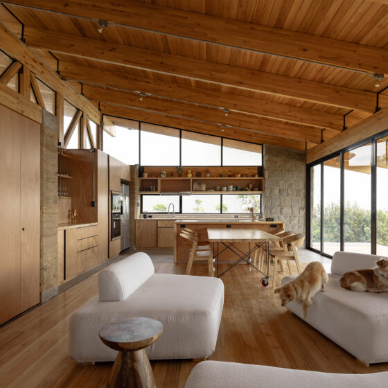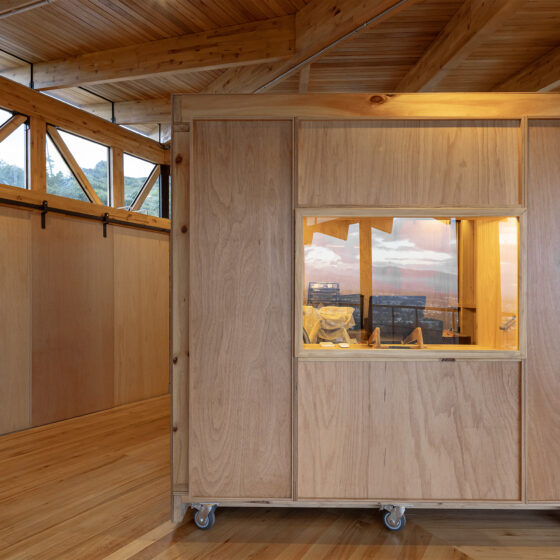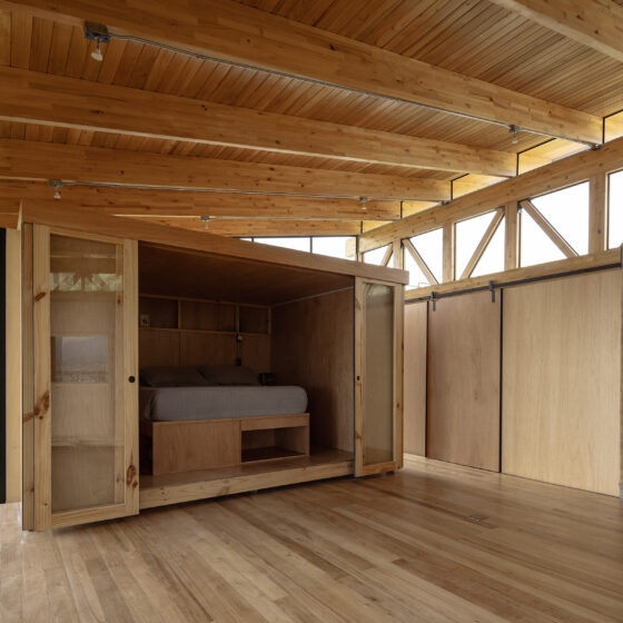 Dentro de este volumen continuo, el proyecto incorpora dos grandes cajas rodantes de madera que contienen los espacios más privados: una, el dormitorio principal con closets y peinadora; la otra, un estudio que se convierte también en área de TV y que incorpora un sofá cama empotrado en el muro. Estas cajas pueden desplazarse, permitiendo que la casa se transforme constantemente: abrirse completamente para reuniones sociales, cerrarse para generar privacidad, o reorganizarse según la luz, el clima o el estado de ánimo de los usuarios.