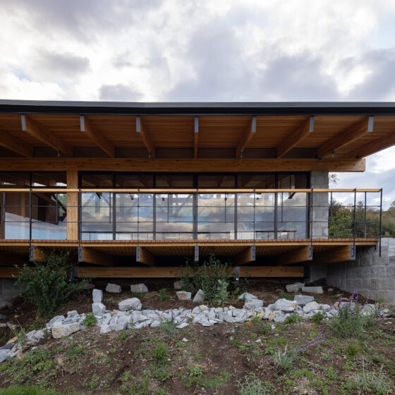 El proyecto establece relaciones complejas con su entorno. Hacia el norte, se protege visualmente de la vía pública, pero permite una lectura permeable a través de la viga que soporta la cubierta, sugiriendo una transparencia controlada. Hacia el sur, en cambio, la casa se abre por completo al paisaje del valle, extendiendo el espacio interior hacia un generoso deck que recorre todo el frente de la vivienda. Este umbral entre el adentro y el afuera se convierte en el lugar privilegiado para la vida cotidiana, el descanso y la contemplación.