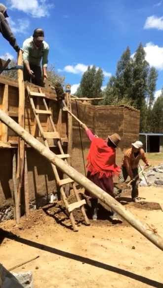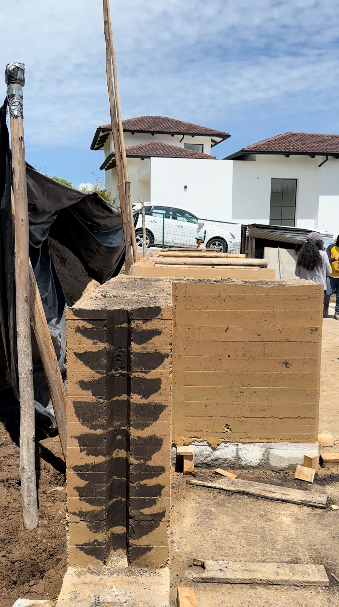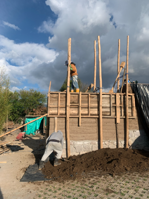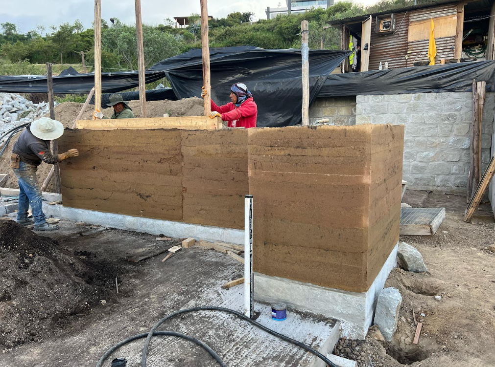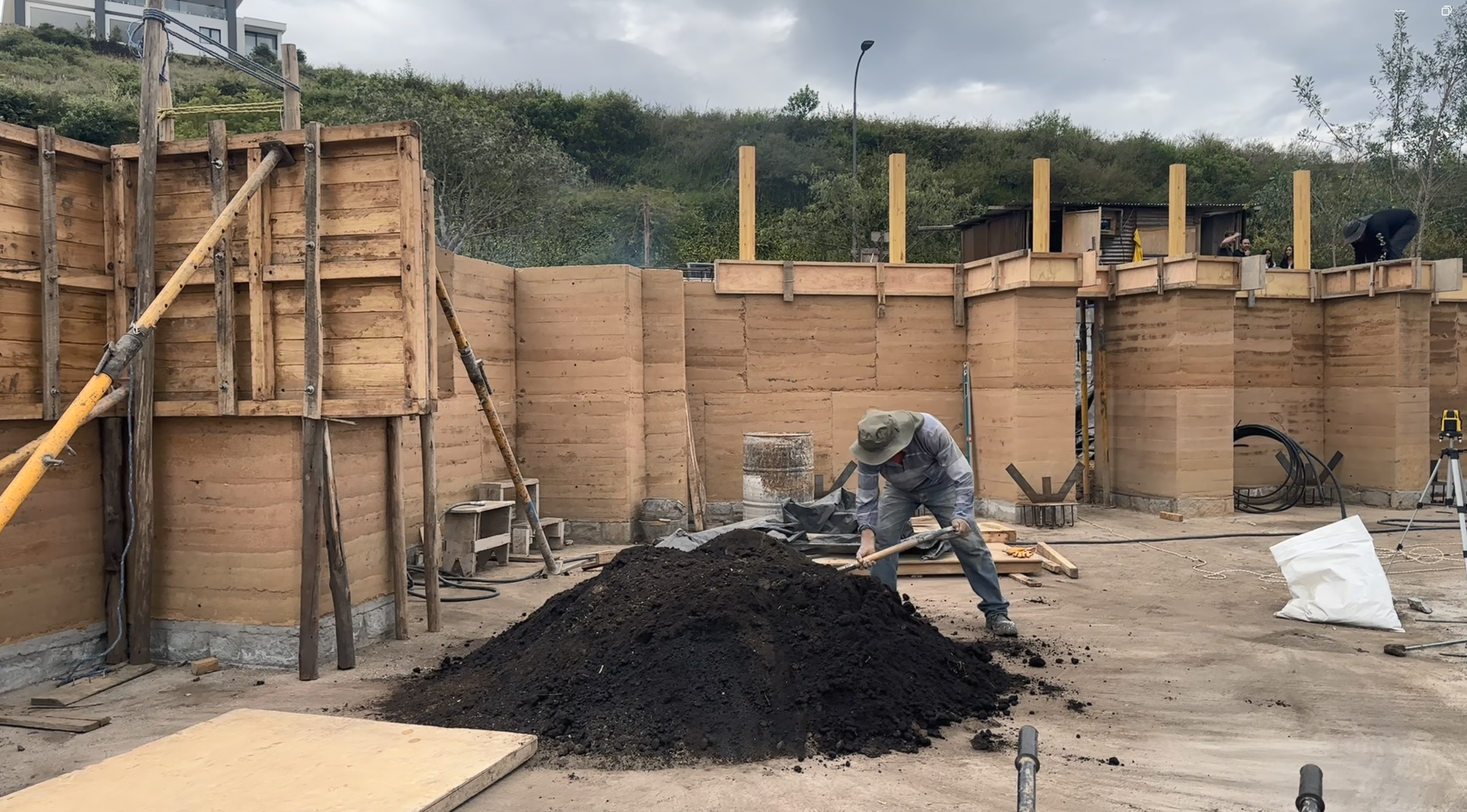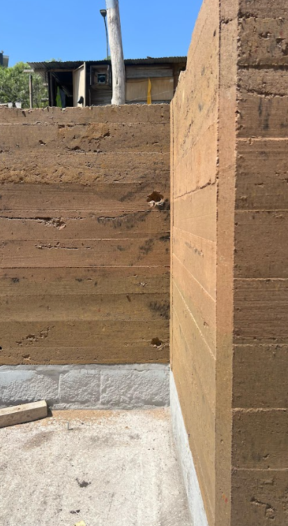 La cimentación y los primeros muros son de piedra del sitio, aportando masa térmica y continuidad material con el entorno. Sobre estos se levanta un muro de tapial calicostrado —una técnica ancestral de construcción con tierra compactada estabilizada— que, además de dar carácter tectónico al proyecto, funciona como elemento estructural, climático y programático.