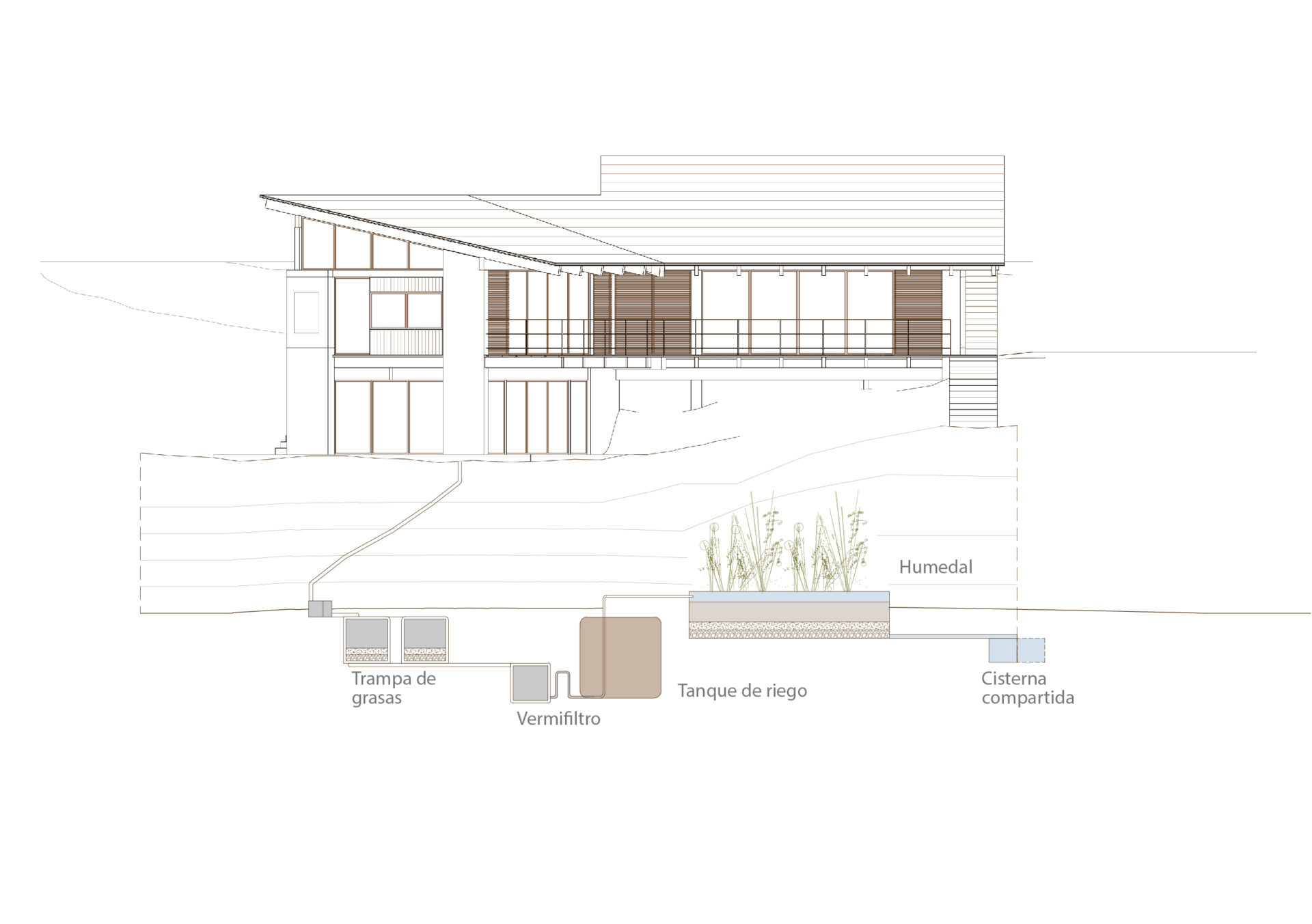 El tratamiento del paisaje fue concebido como una extensión del ecosistema natural: se utilizaron especies endémicas de bajo mantenimiento, se redujo al mínimo el césped y se diseñó un huerto como parte integral del sistema de vida. El agua, elemento central de la propuesta urbanística, es gestionada a través de infiltración de aguas lluvias, separación de aguas grises y negras, tratamiento biológico con vermifiltro, y un sistema híbrido de energía solar para calentamiento de agua y apoyo fotovoltaico.